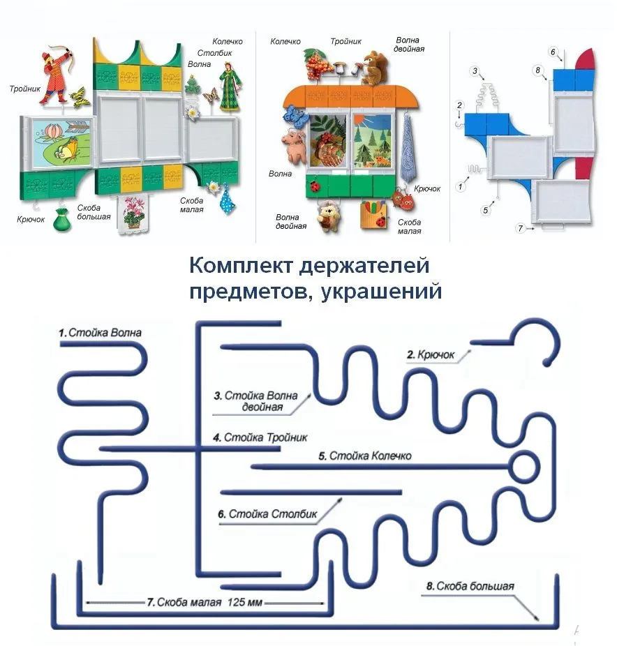 Комплект держателей предметов, украшений (24 точки крепления по контуру стенда) — отличное дополнение для превращения фантастического стенда в тематическую выставку творчества детишек. Фантазийный стенд располагает и к массе ярких сюжетно-ролевых игр.