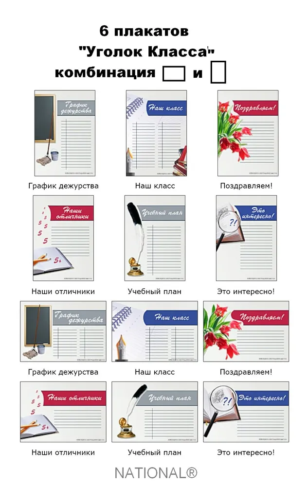 В наборе 15 плакатов А4 по следующим тематикам: здоровый образ жизни, классный уголок, символика России и др.